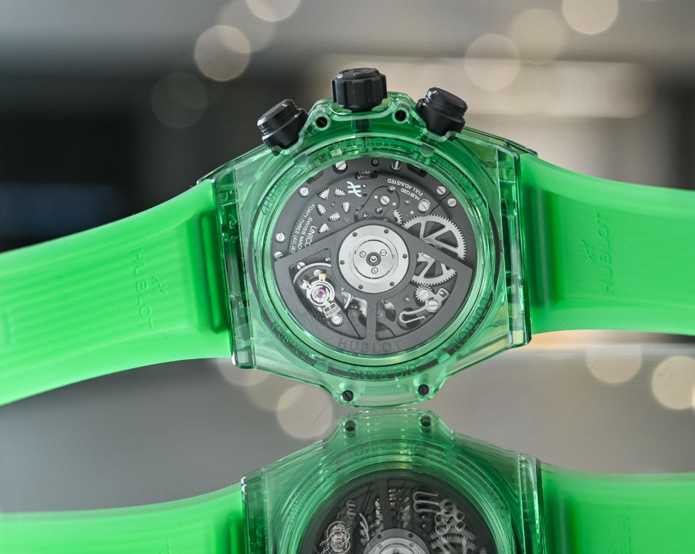 The polished sapphire case of the best replica Hublot Big Bang Unico Saxem Green watches has a 42mm diameter and a thickness of 14.5mm, featuring an exhibition caseback and bezel crafted from this innovative and durable material. Complementing the overall green-and-black aesthetic, the signature H-shaped screws are made from black-plated titanium, while the crown and chronograph pushers are finished in black PVD. The watch looks substantial – it’s named Big Bang for a reason – yet it exudes a comfortable and wearable feel once secured on the wrist with a rubber strap.