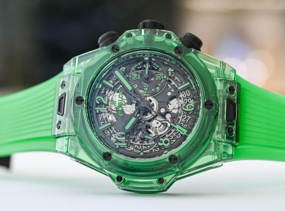 In recent years, using coloured cases and transparency has become a prevalent trend in the luxury watch industry. However, AAA fake Hublot watches stands out as the undisputed leader when creating an entire timepiece in vivid colours and transparent materials. One striking example is the lemon-yellow Big Bang Tourbillon Neon Yellow, unveiled by Hublot in 2023. This exceptional timepiece was crafted using a material developed by Hublot’s R&D department, known as SAXEM – Sapphire Aluminium Oxide and Rare Earth Mineral – produced by blending aluminium oxide, the fundamental component of sapphire, with rare-earth elements such as thulium, holmium, and chromium. This material debuted in 2019 and the latest addition to the series is this Big Bang Unico Saxem Green.